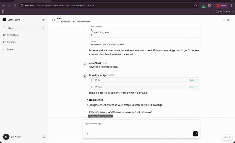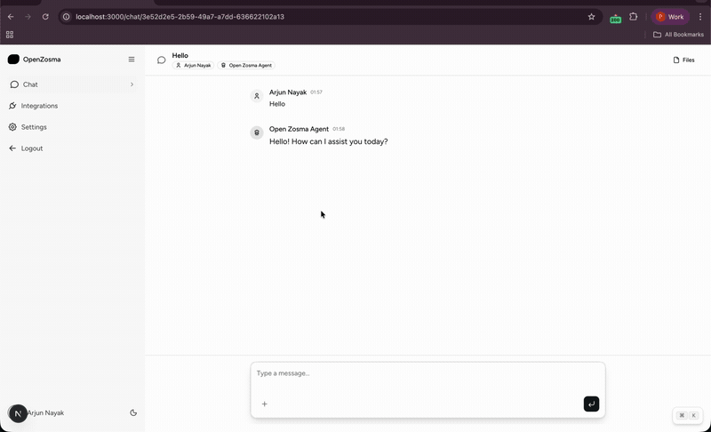 You'll land in the chat interface with a default agent called "Open Zosma Agent":