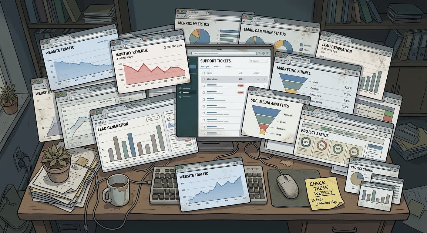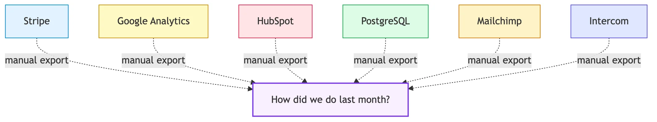 The result is 15+ dashboards across 15+ tools. Each one shows a narrow slice of your business through its own particular lens. None of them talk to each other. The only integration layer is you, a browser, and a spreadsheet.