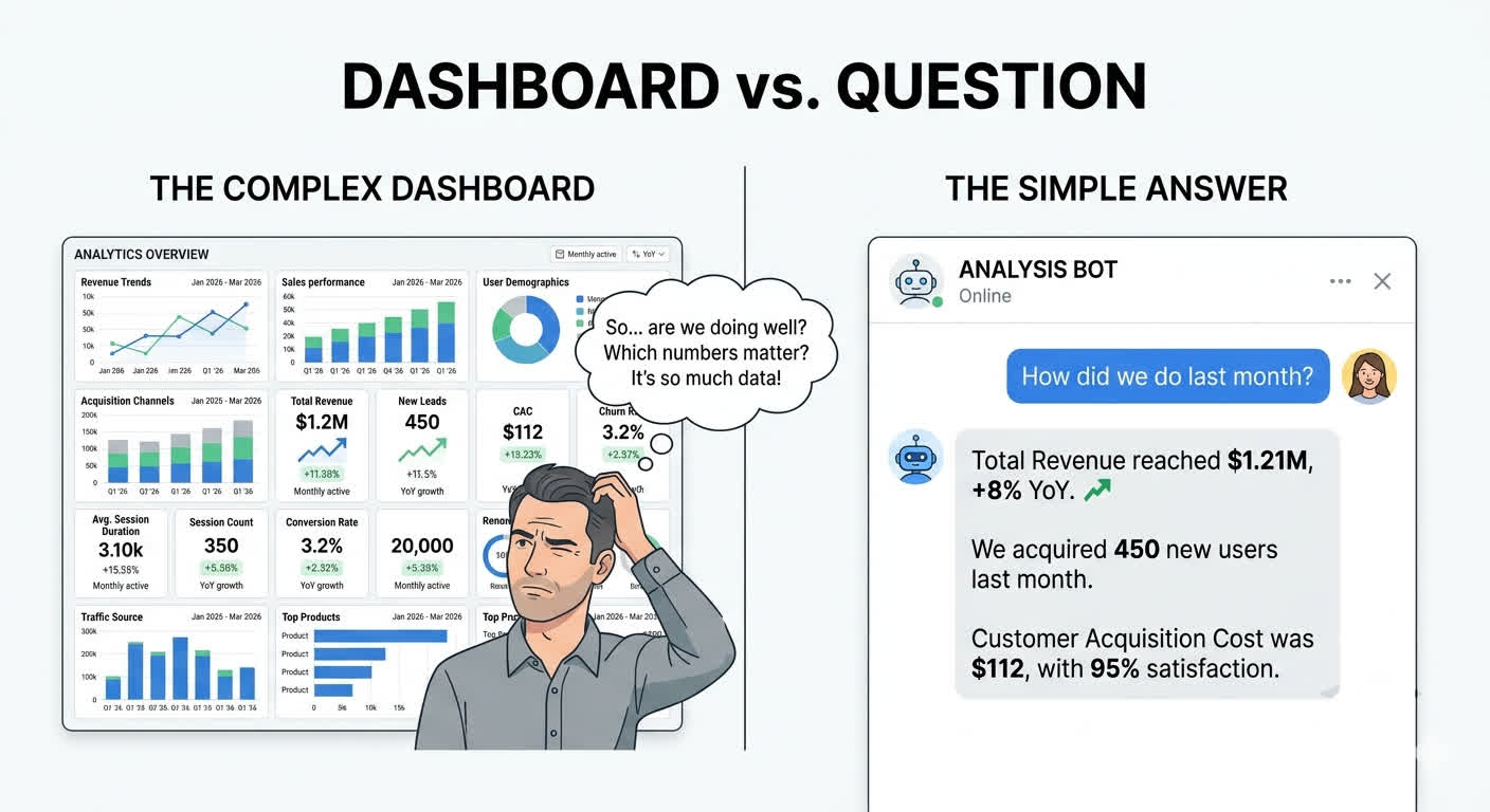 But even when you do check, there's a more fundamental limitation. Dashboards answer questions you've already thought to ask. They show pre-defined metrics. They're good at "what was revenue last month?" because someone set up that chart.