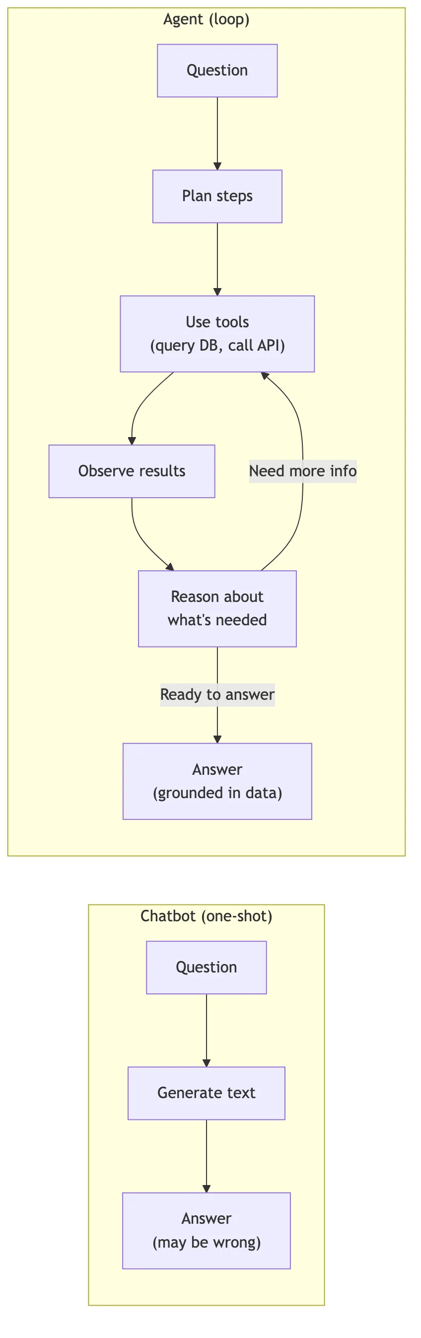 When you ask a chatbot "which product had the highest return rate last quarter?", it generates a plausible-sounding answer based on patterns in its training data. When you ask an agent the same question, it connects to your returns database, runs the query, cross-references with sales volume to calculate the rate, and gives you a number with a source. If the data looks weird (say, a spike in week 7), it might flag that too. Not because someone told it to, but because the observation step in its loop noticed something unexpected.