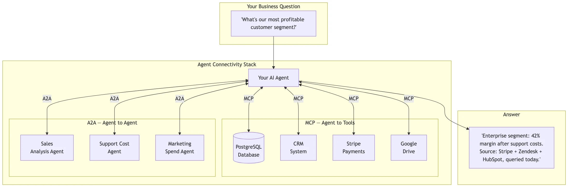 Why does this matter? Because real business problems don't live in one system. "What's our most profitable customer segment?" might require one agent to pull sales data, another to calculate support costs, and a third to factor in marketing spend. A2A lets them coordinate.