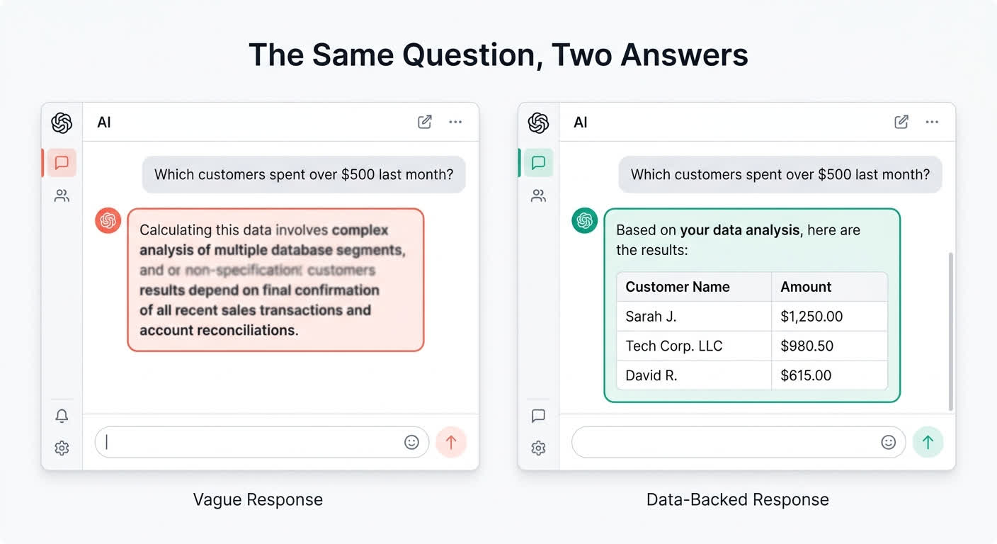 But the chatbot problem and the dashboard problem share the same root cause. Your AI isn't connected to your actual business data. It's either guessing (the chatbot) or sitting there waiting for you to come look (the dashboard). One is dangerously proactive. The other is expensively passive. Neither gives you what you actually need: real answers from your real data, when you ask for them.