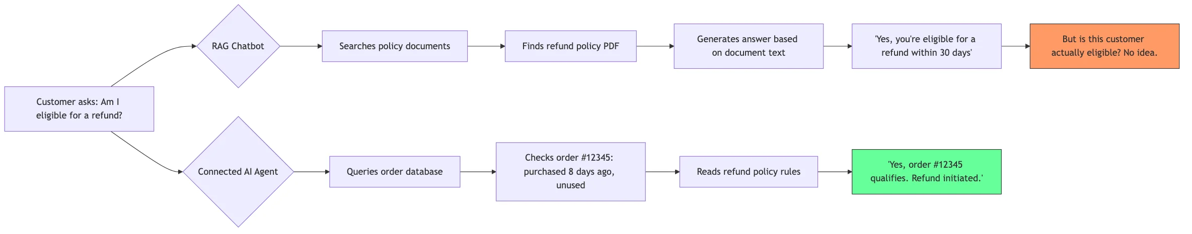The fundamental limitation of RAG is this: it searches documents. It doesn't query live systems. A RAG system can "retrieve" your refund policy document, but it cannot check whether order #12345 is actually eligible for a refund based on the purchase date, item condition, and customer history. That answer lives in your database, not in a PDF.